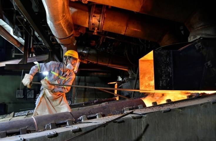 铜陵有色金冠铜业分公司双闪冶炼车间闪速熔炼炉旁,炉前作业人员正在顶着热浪有序进行放渣作业。 储著传摄