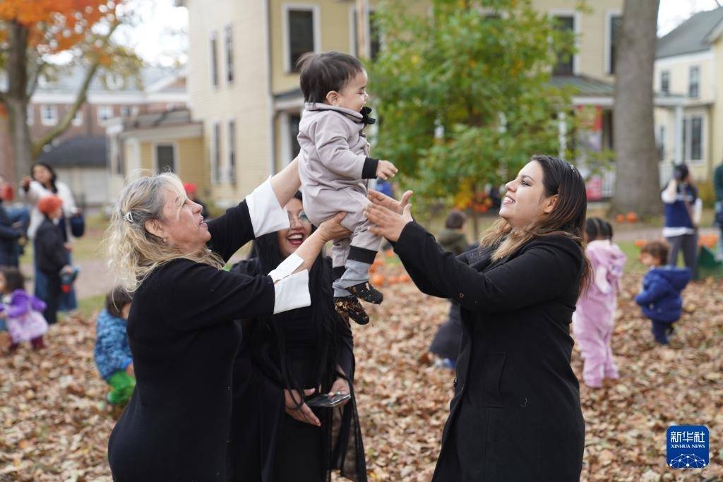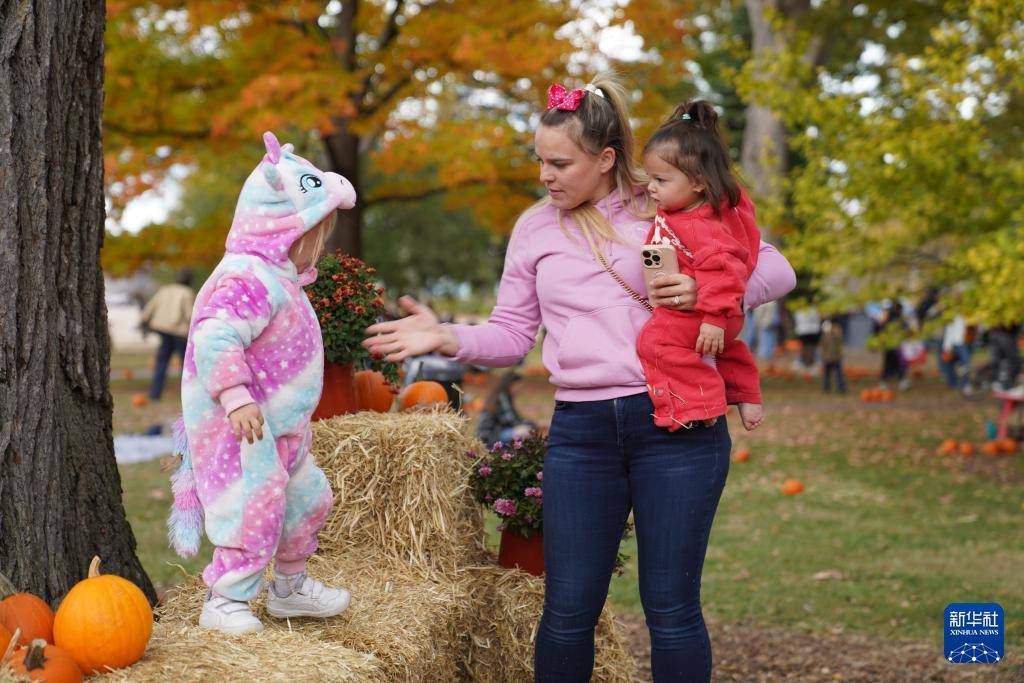 10月25日,在美国纽约总督岛,人们带着孩子参加秋日节。