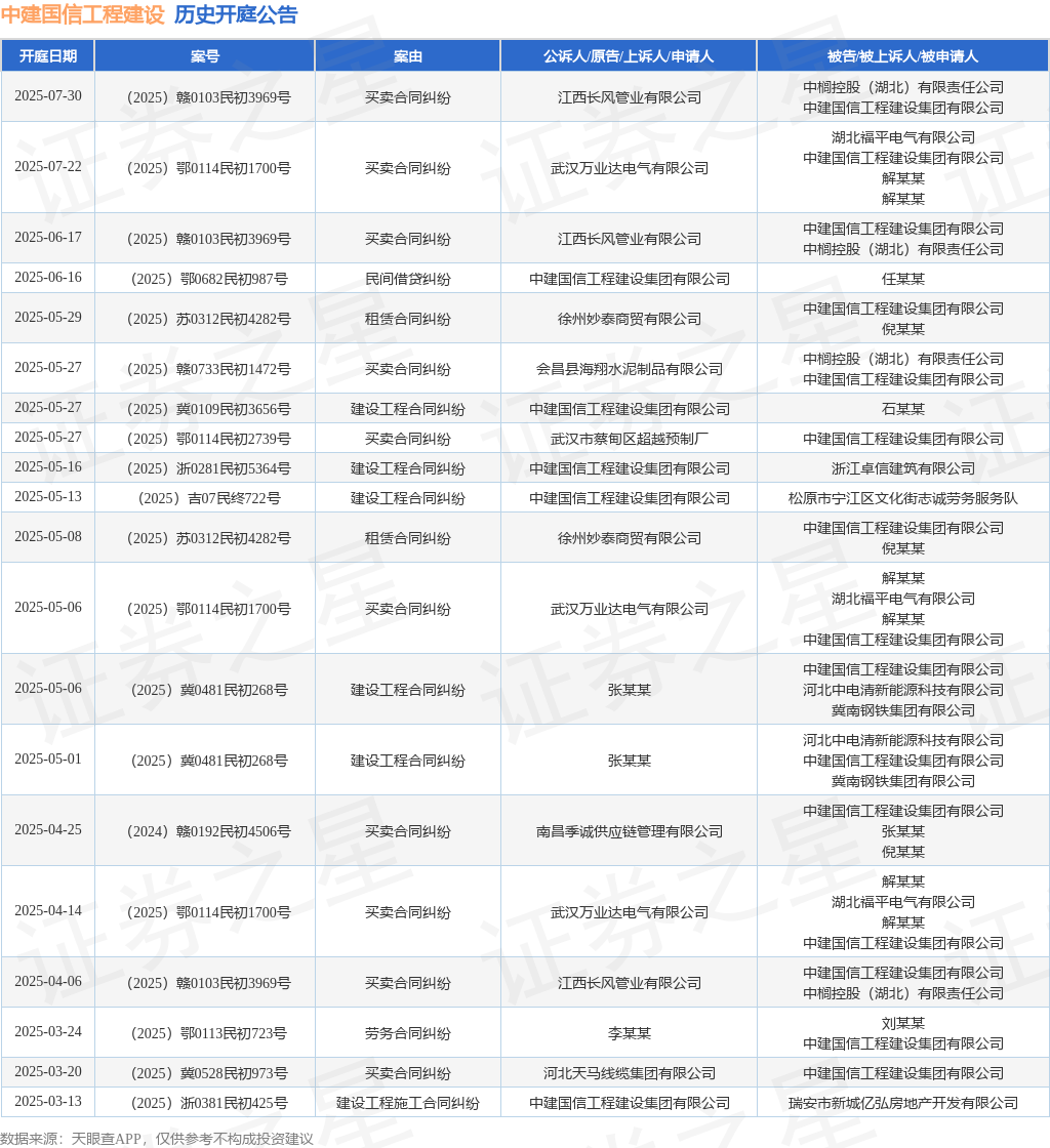 案号:(2025)赣0103民初3969号审理法院:南昌市西湖区人民法院案由:买卖合同纠纷当事人信息: 原告/上诉人:江西长风管业有限公司 被告/被上诉人:中建国信工程建设集团有限公司、中榈控股(湖北)有限责任公司开庭日期:2025年6月17日根据统计,近一年内以中建国信工程建设集团有限公司为当事人的历史开庭公告有41则,其中案由为“买卖合同纠纷”的公告以17则居首,其次为“建设工程合同纠纷”有8则,“建设工程施工合同纠纷”有7则。历史开庭公告(前20条)如下: